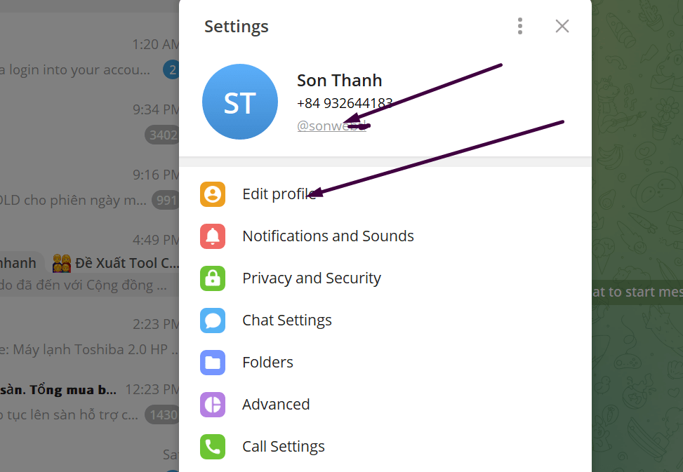 Nếu bạn dùng Telegram nhưng chưa tạo username thì bạn truy cập vào ứng dụng telegram trên desktop hoặc mobile , chọn menu Settings->Edit profile và nhập username như hình ,sau đó bạn copy username vào ô UserName telegram