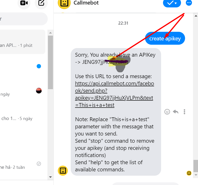 Bạn chỉ cần click liên kết sau: https://m.me/api.callmebot , Sau đó gõ create apikey trong message Facebook , 1 apikey FacebookMessage sẽ được tạo như sau:
